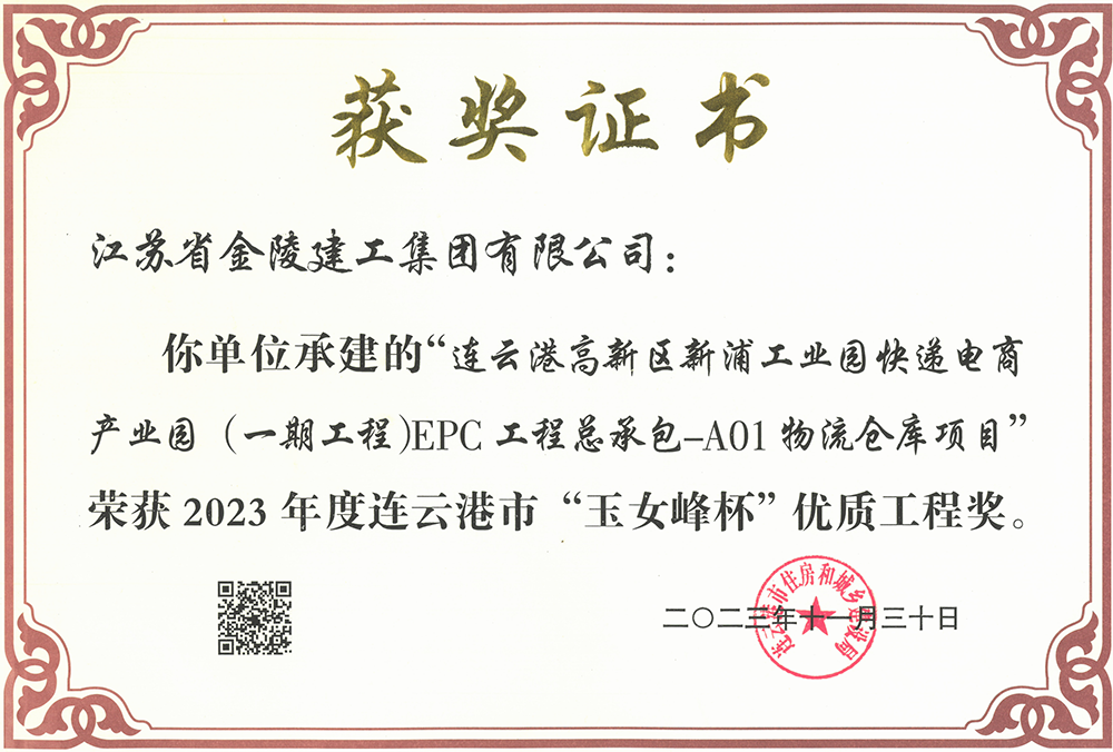 玉女峰杯優質工程獎證書